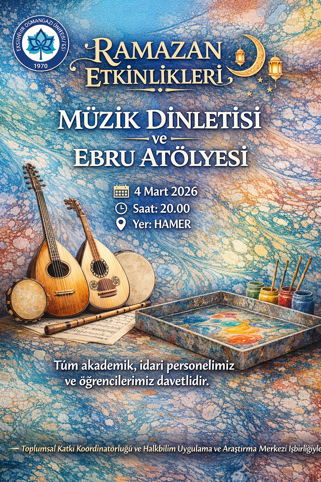 Ramazan Etkinlikleri 2026 programı kapsamında, 4 Mart 2026 Çarşamba günü saat 20.00’de HAMER’de “Müzik Dinletisi ve Ebru Atölyesi” gerçekleştirilecektir.